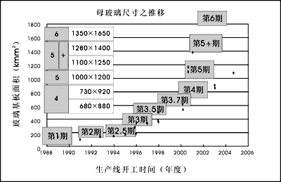 ??示圖1 母玻璃尺寸在2001年第5期時(1200mm*1200mm級)、2002~2003年時第5+期(1100mm*1250mm級)及6期(1250mm*1650mm級)等尺寸的生產(chǎn)予預測速度。